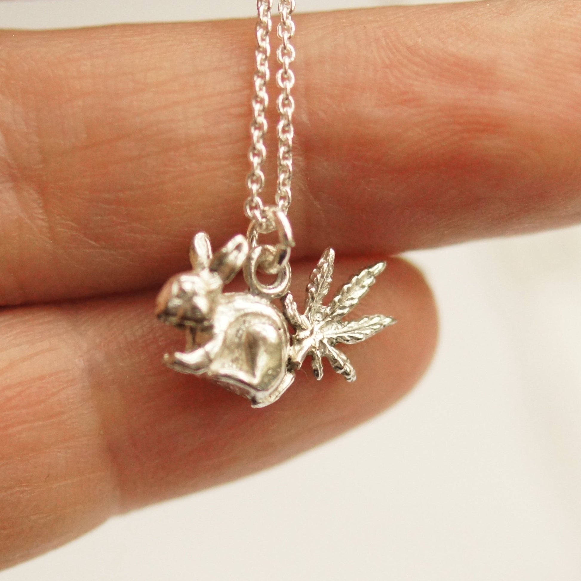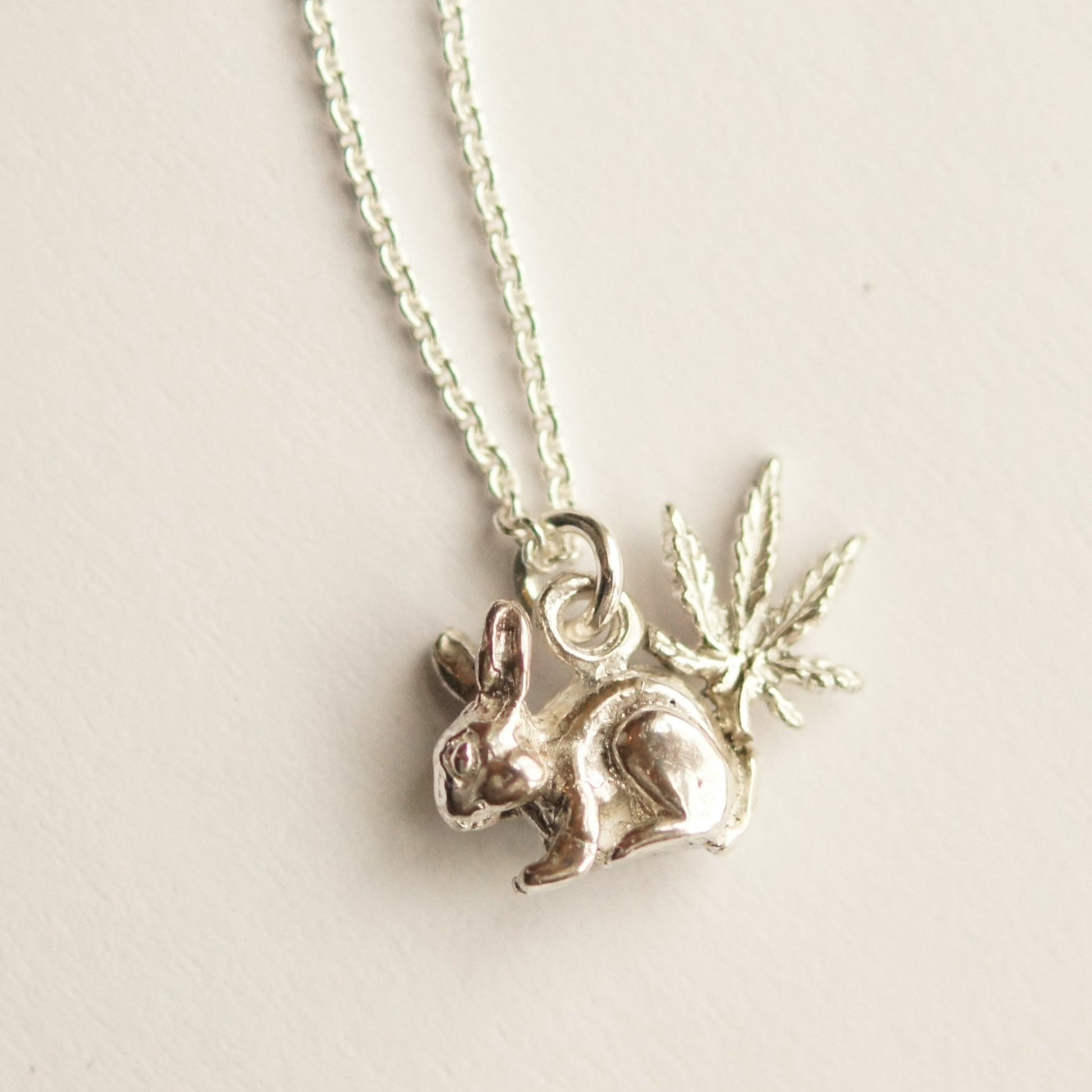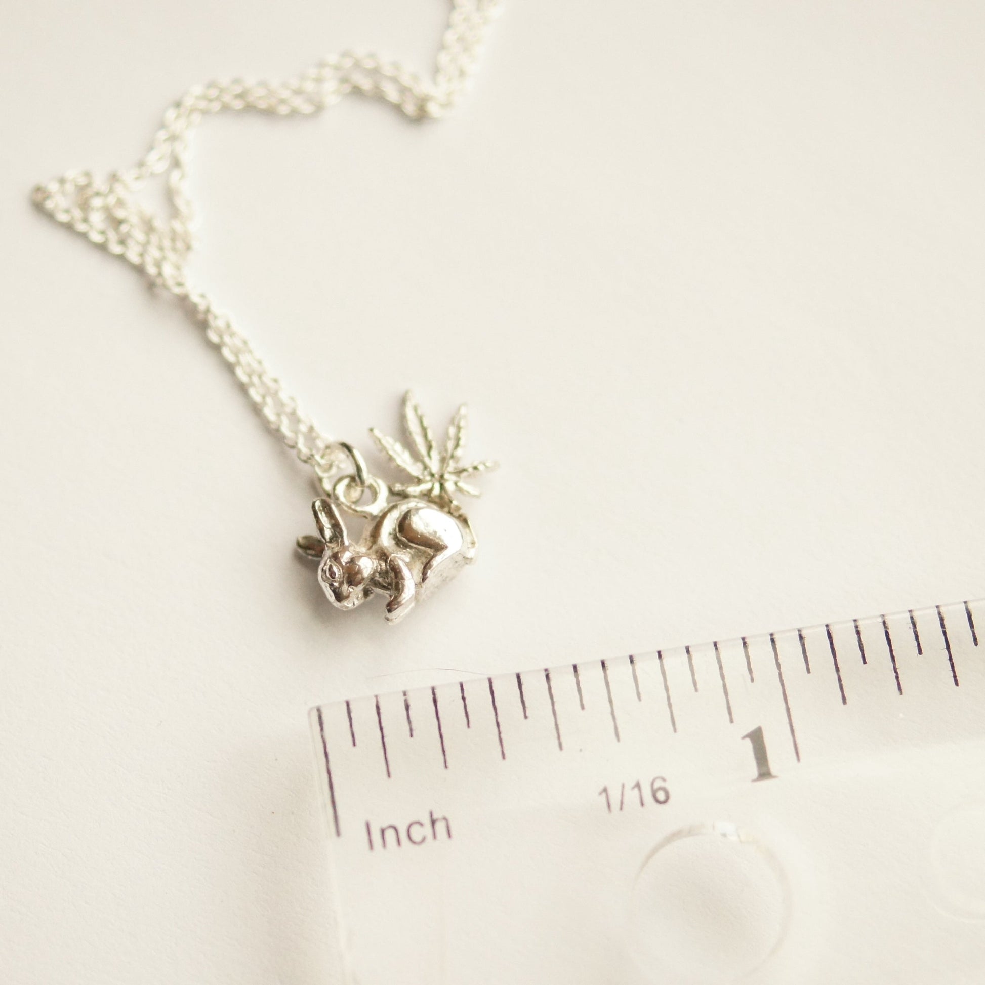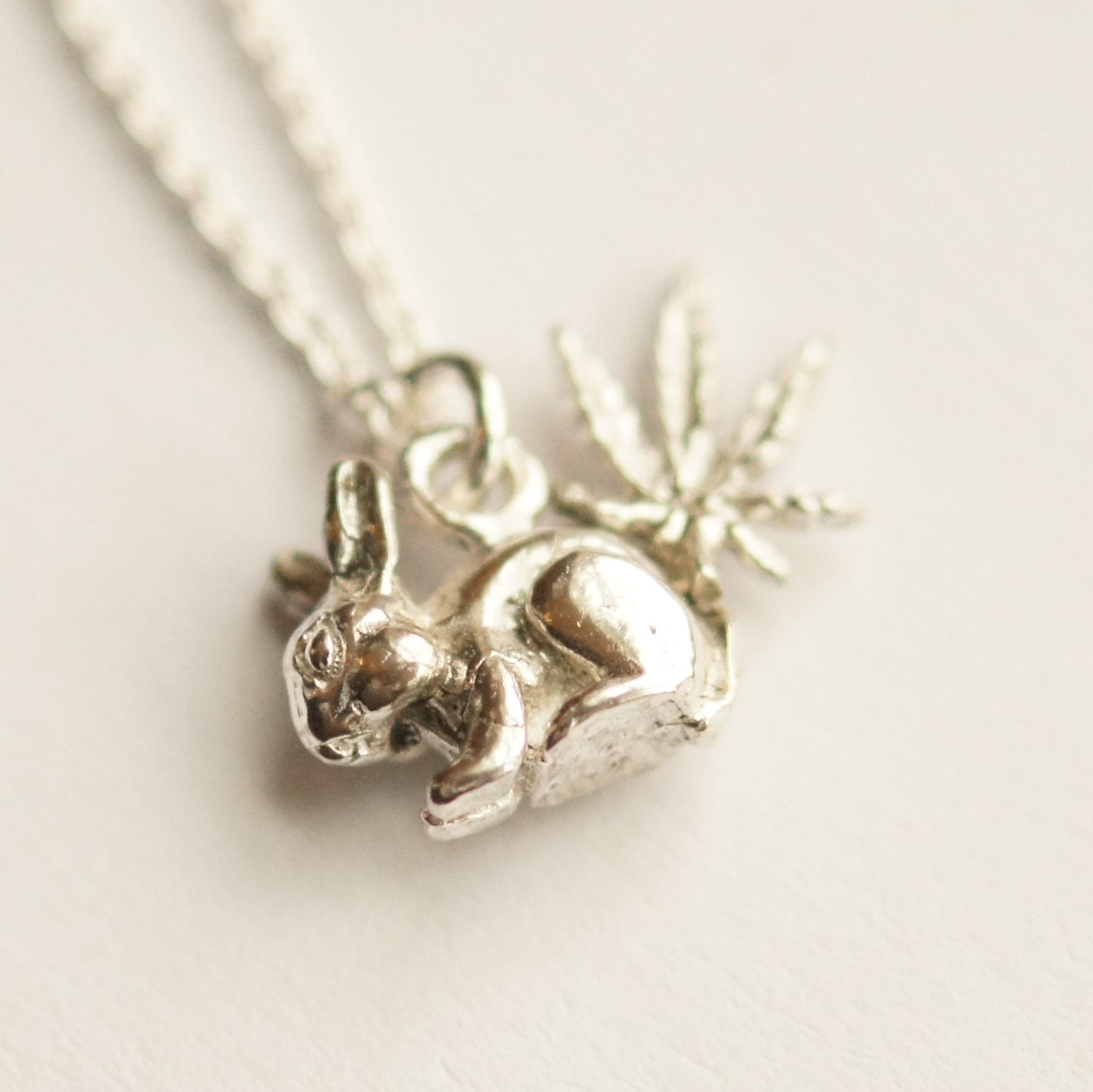 Cute little sterling silver bunny with some 420 lettuce. Happy Easter and 420! Made using lost wax cast method in Vancouver BC . Choose your chain length from sterling silver Italian made chain or adjustable black cotton cord.