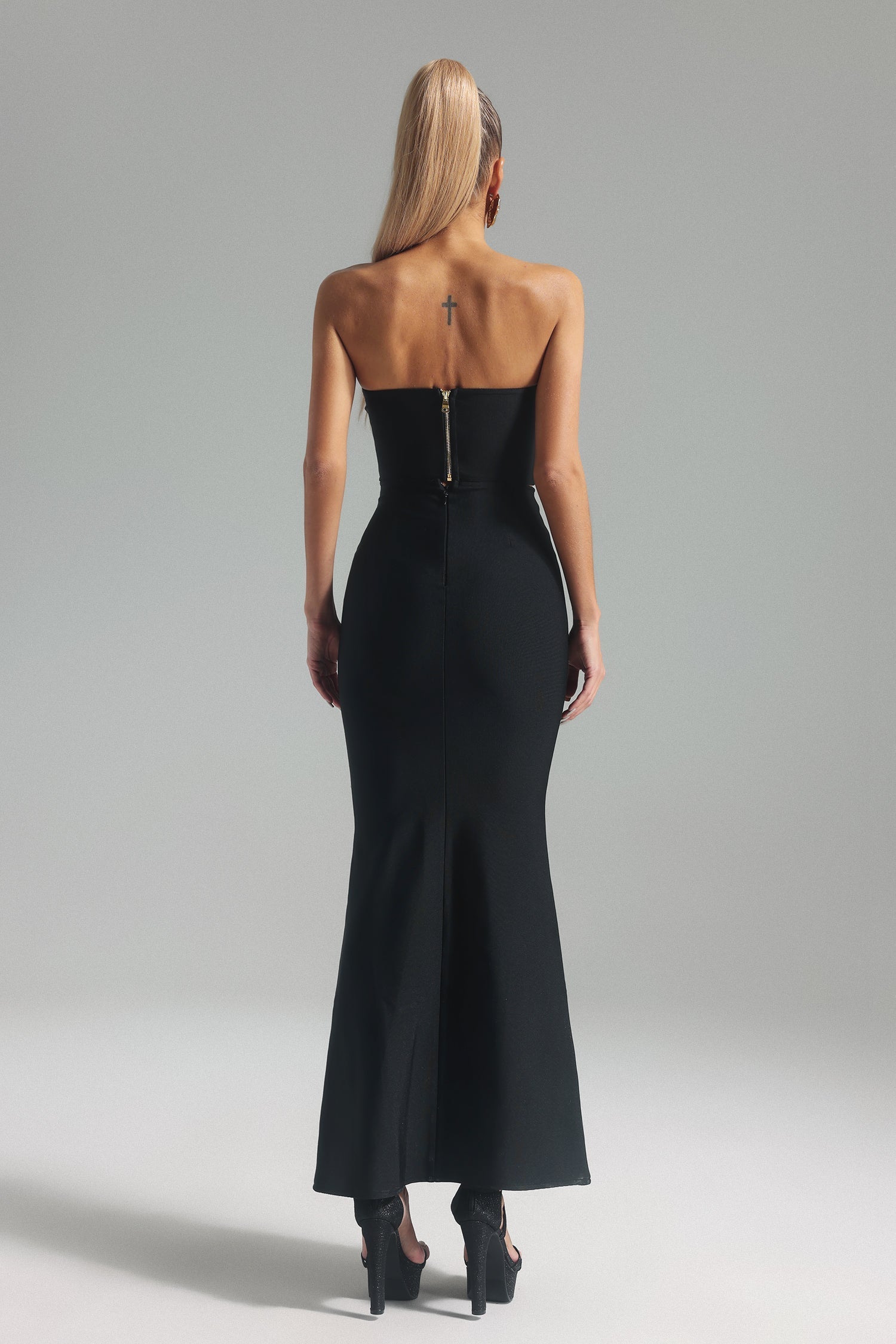 - Luxurious black fabric in a flattering cut