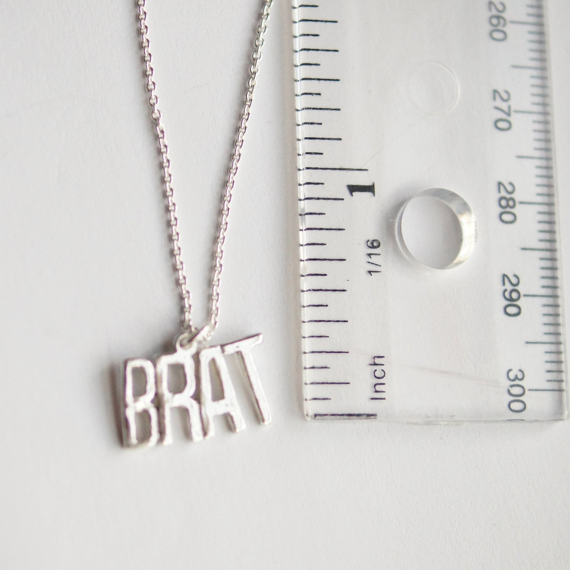 Brat sterling silver word pendant. BRAT has been made by lost wax cast method in Vancouver BC Canada and hanging on adjustable black cord or Italian sterling silver chain extra.