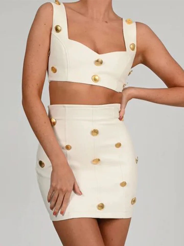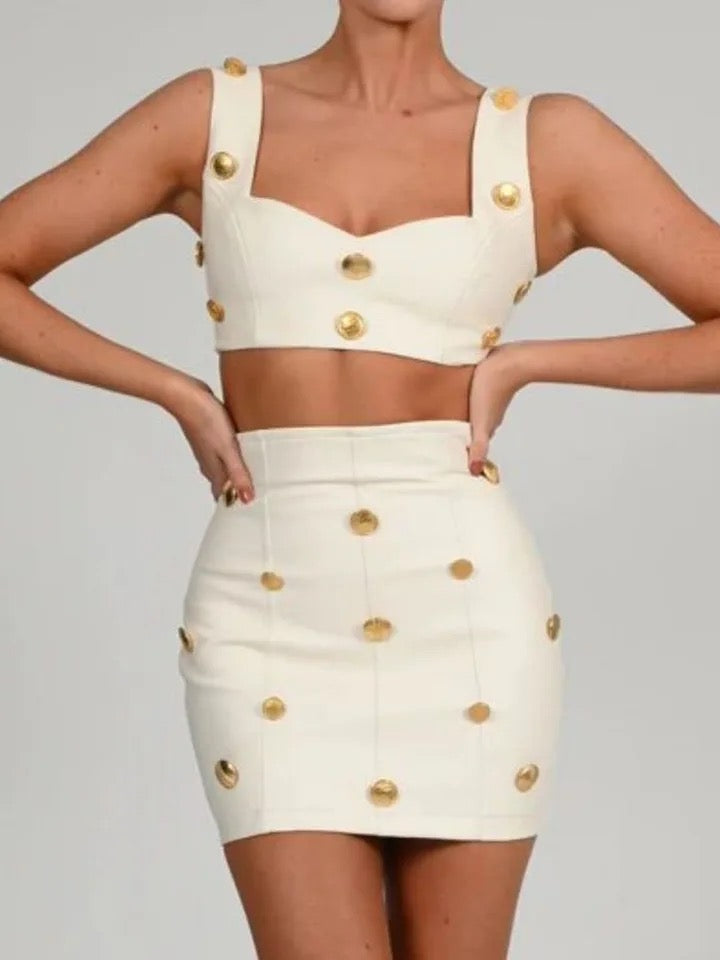 With its timeless color combination and subtle glam details, the Golden Hour Set ensures all eyes will be on you as soon as you walk in the room. The cream fabric hugs your curves in all the right places, while the metallic gold accents add a hint of glitz and sophistication.