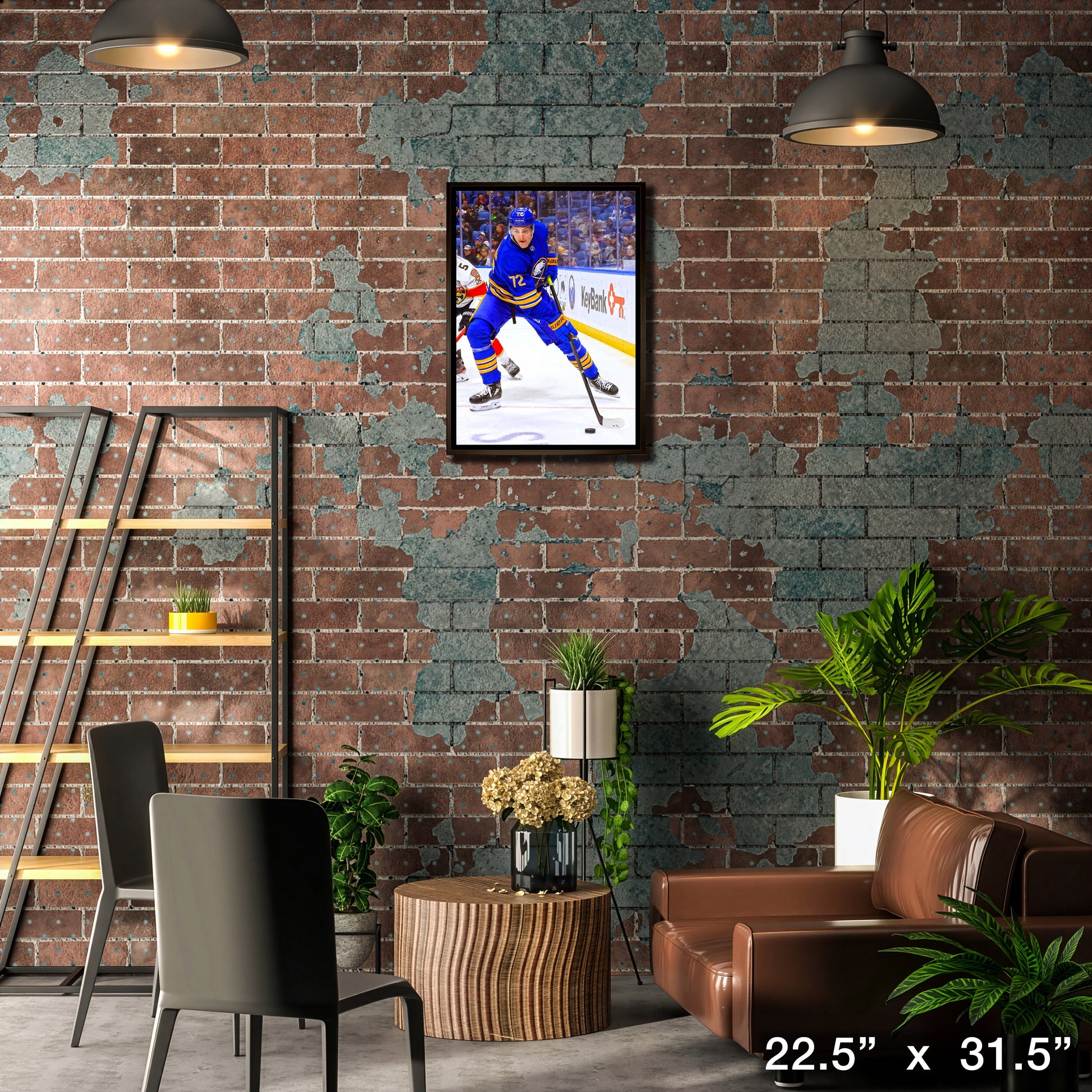 This image of Tage Thompson is printed on high quality art canvas and then professionally stretched and framed. This canvas is officially licensed by the National Hockey League (NHL) and National Hockey League Players Association (NHLPA). Made in Canada.. Finished Size: 22.5 x 31.5"