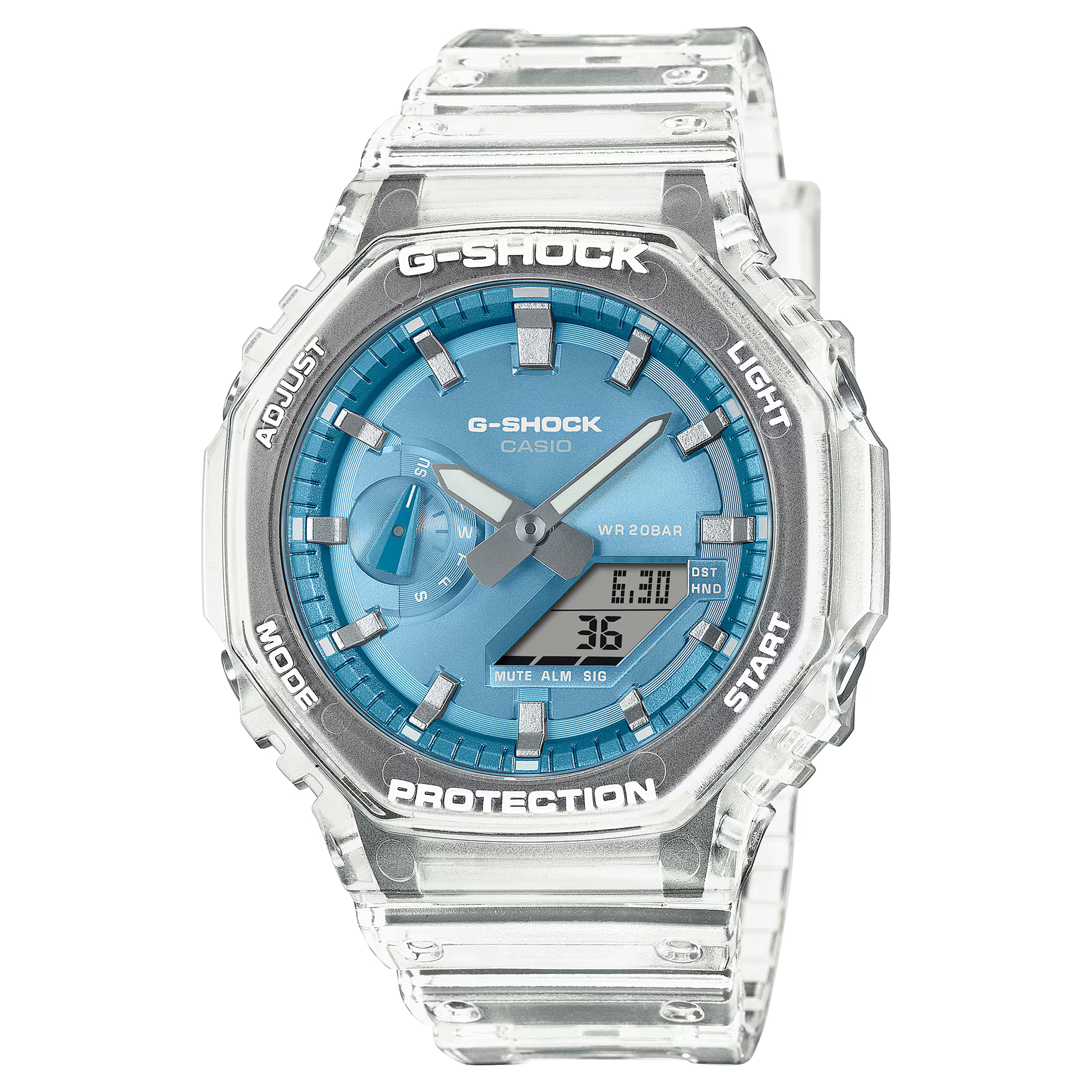 The GA-2100 with octagonal bezel is paired with a dial finished in metallic vapor deposition in popular color — sky blue — offset by a translucent band for a confidently cool look.