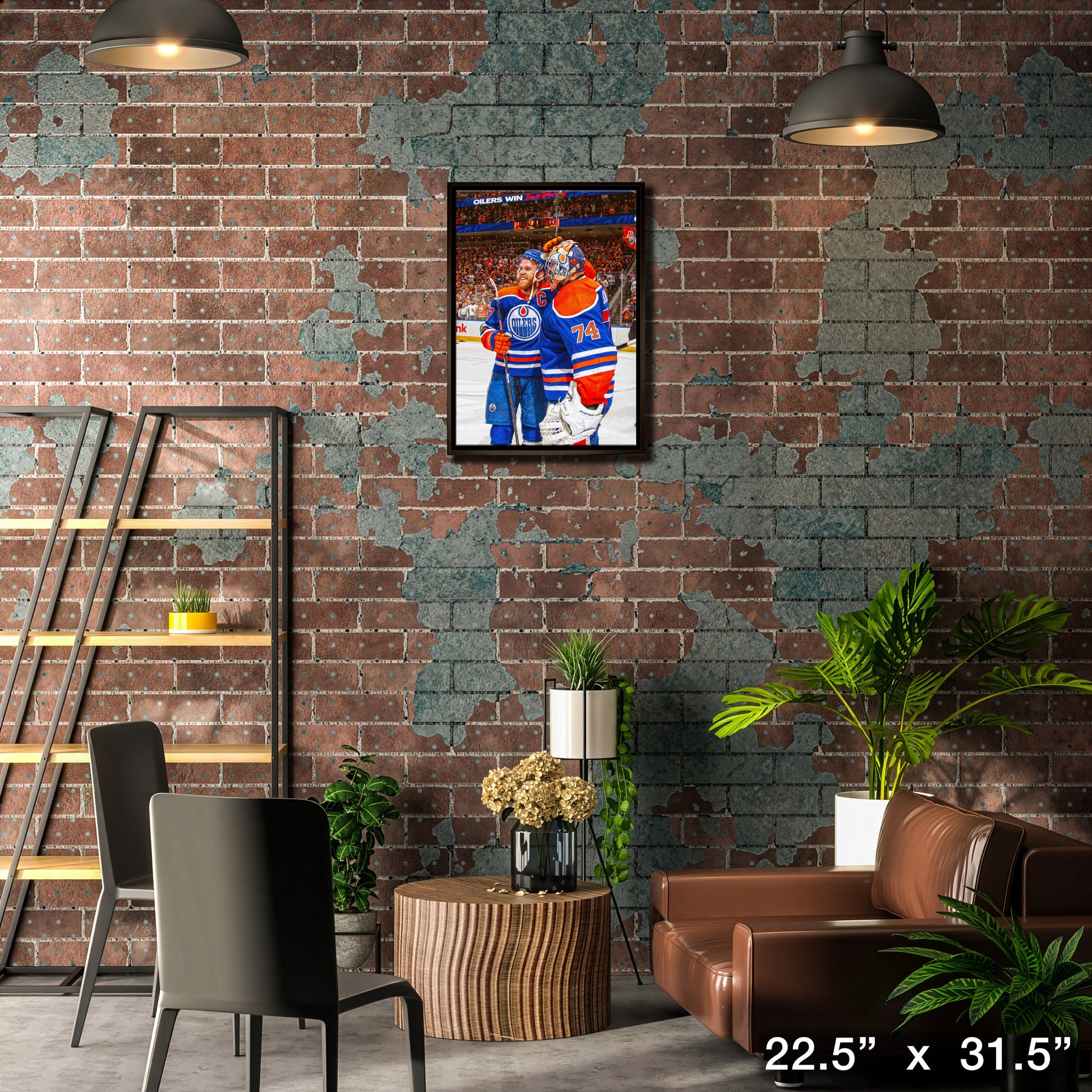 This image of Connor McDavid is printed on high quality art canvas and then professionally stretched and framed. This canvas is officially licensed by the National Hockey League (NHL) and National Hockey League Players Association (NHLPA). Made in Canada. Finished Size: 22.5 x 31.5"