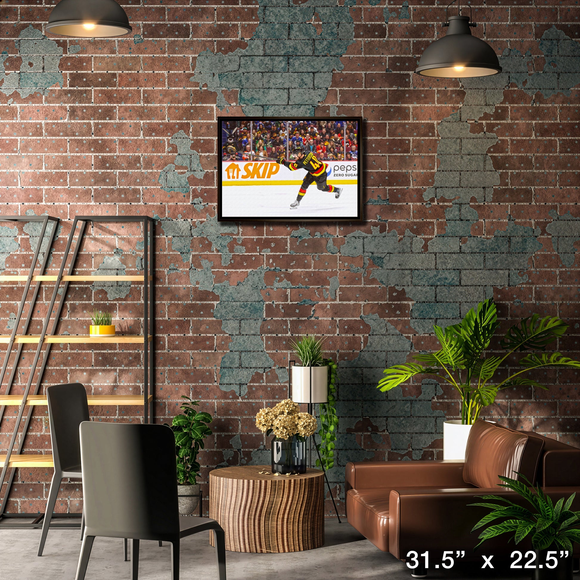 This image of Elias Pettersson is printed on high quality art canvas and then professionally stretched and framed. This canvas is officially licensed by the National Hockey League (NHL) and National Hockey League Players Association (NHLPA). Made in Canada.. Finished Size: 31.5 x 22.5"