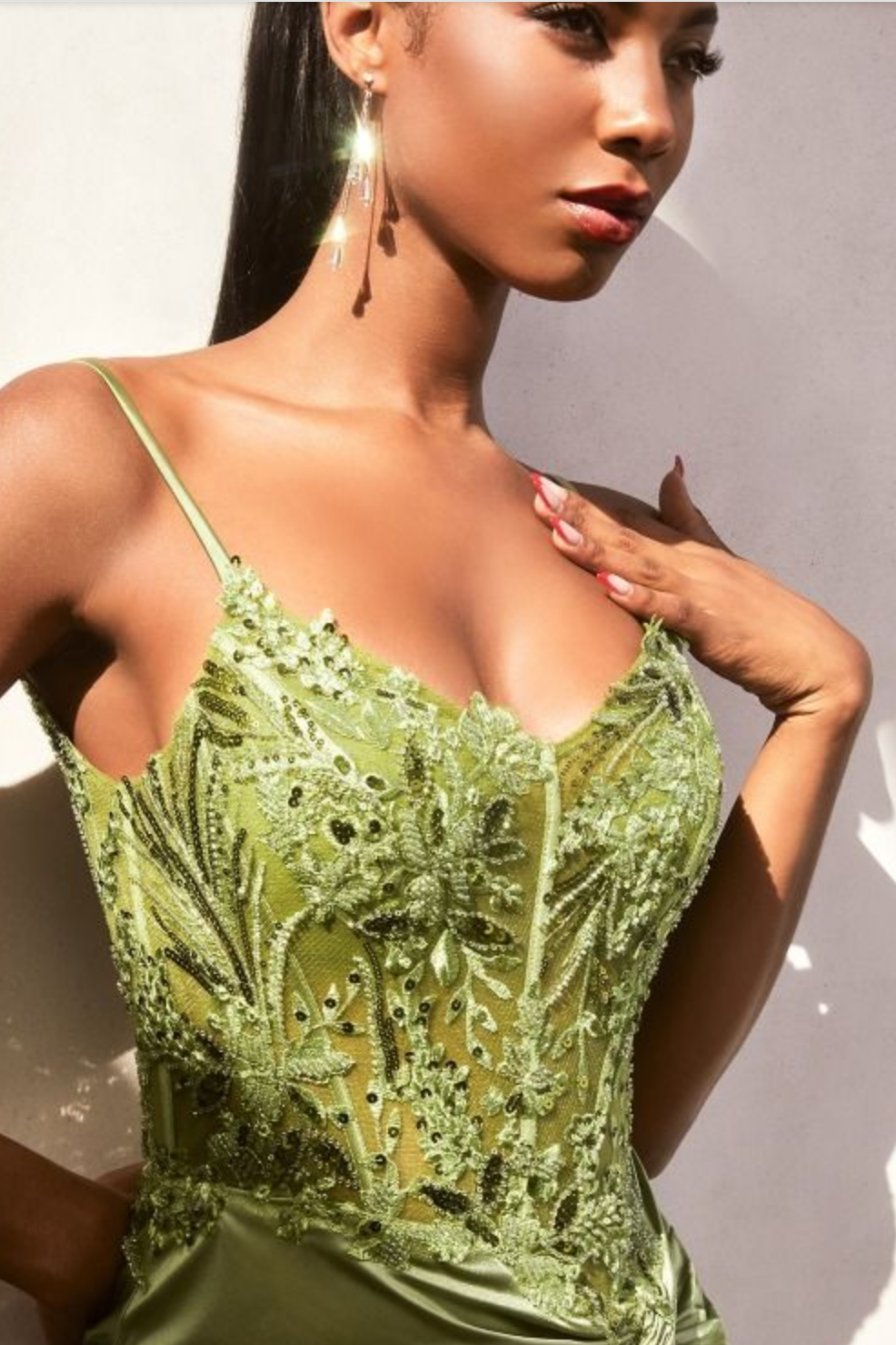 FITTED SATIN GOWN WITH EMBELLISHED BODICE