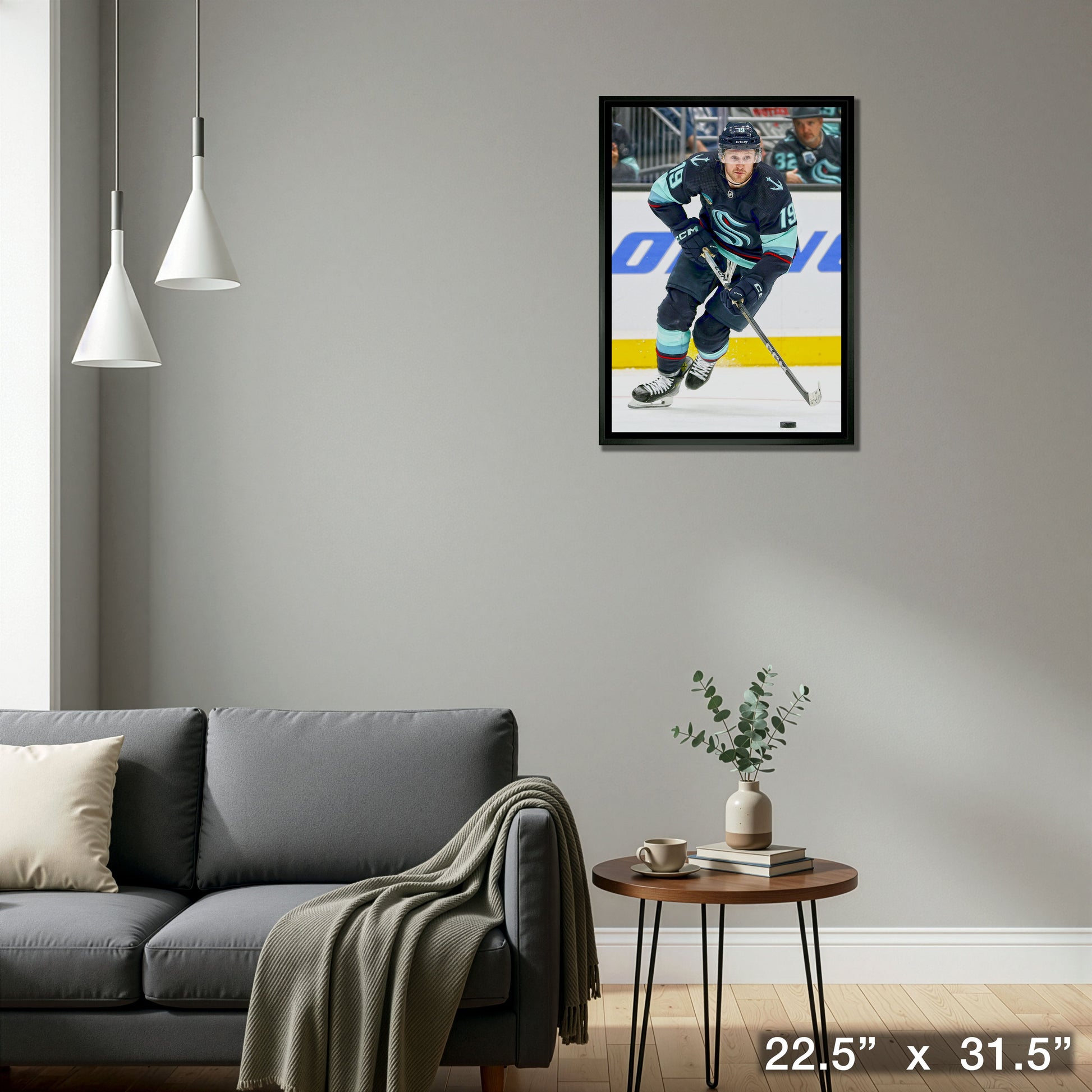 This image of Jared McCann is printed on high quality art canvas and then professionally stretched and framed. This canvas is officially licensed by the National Hockey League (NHL) and National Hockey League Players Association (NHLPA). Made in Canada.. Finished Size: 22.5 x 31.5"