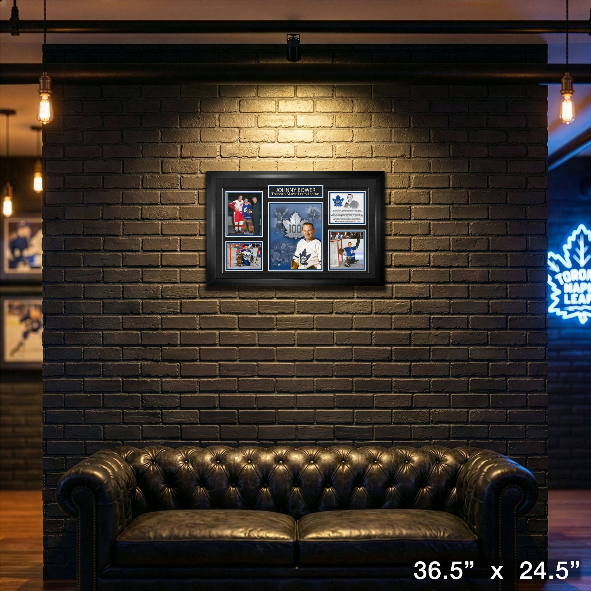 This Johnny Bower career collage is professionally framed. This item is officially licensed by the National Hockey League (NHL). Made in Canada.