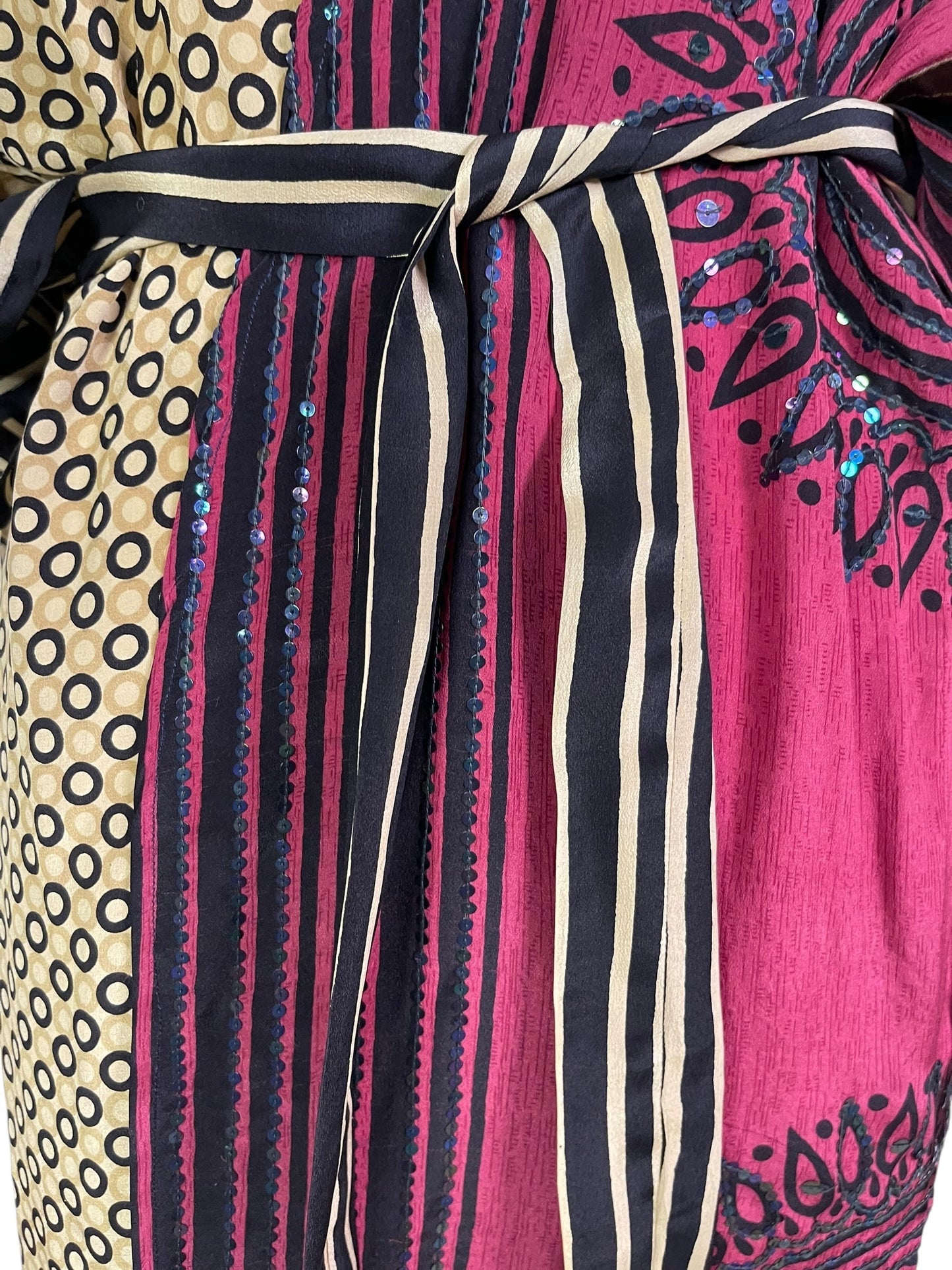 In Eastern philosophy, an Avatar is an incarnation that teaches how to evolve virtues of the past into the present. The Pure Upcycled Silk Avatar Collection is made from vintage pure silk saris, chosen and worn by women in the past to celebrate their lives.If you look very closely, you will see that the silks in this collection show some of the character of their previous incarnations through the appliqués that have been lovingly applied to bring new life to the fabric. This piece is a reminder that we are part of a collective journey to which we all add a little something.