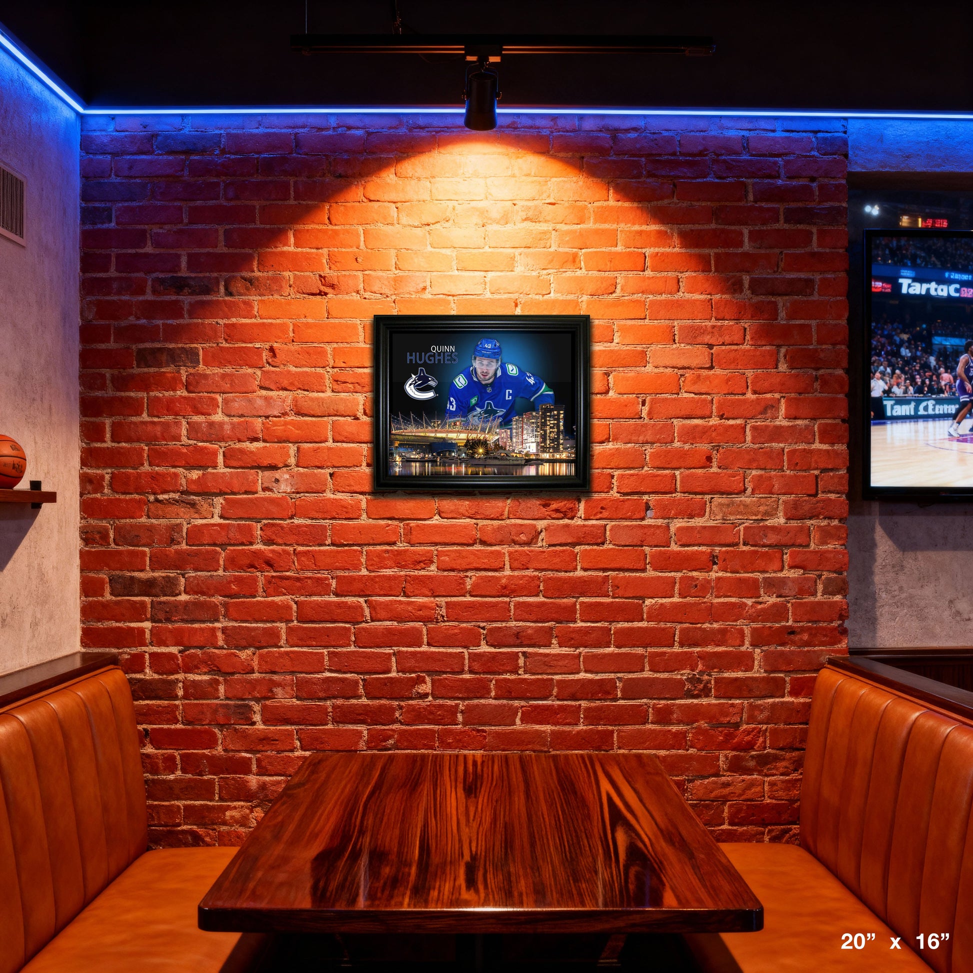 This image of Quinn Hughes is printed on high quality photo paper and then professionally framed. This print is officially licensed by the National Hockey League (NHL) and National Hockey League Players Association (NHLPA). Made in Canada. Finsihed Size: 20x16"