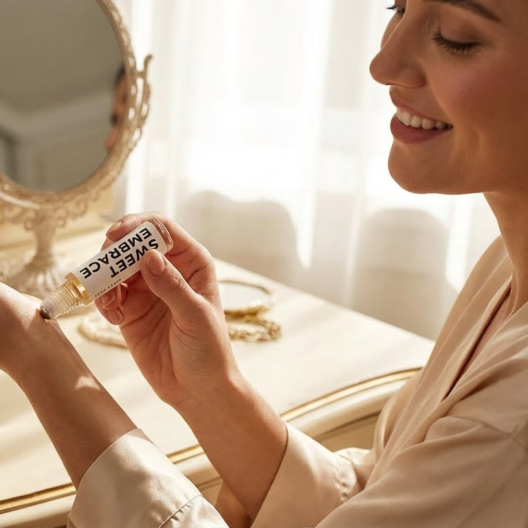 SWEET EMBRACE is a long-lasting sweet floral perfume oil that charms with its cozy, playful vibe. It opens with a bright hit of citrus, neroli, and bergamot, giving the scent an instant spark.