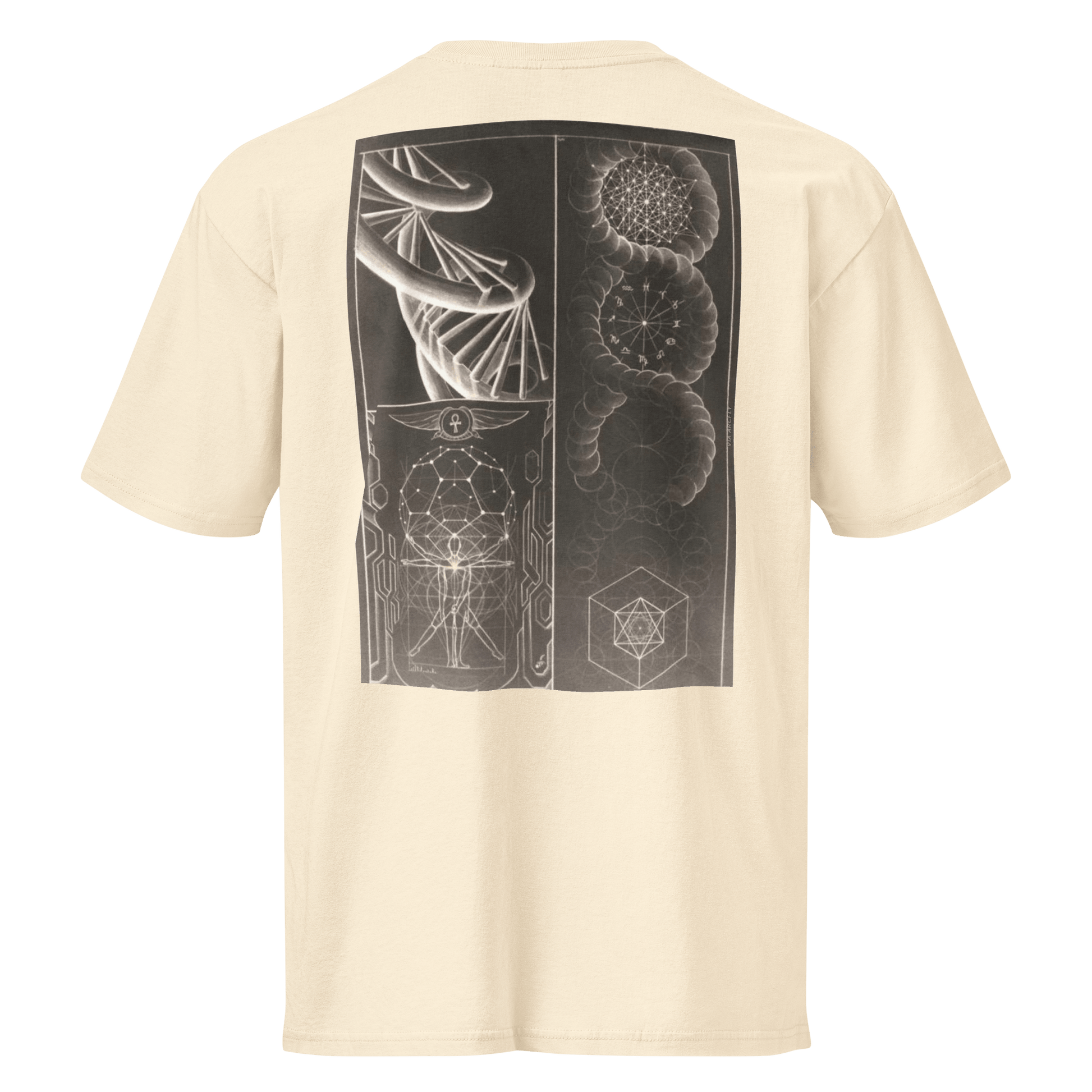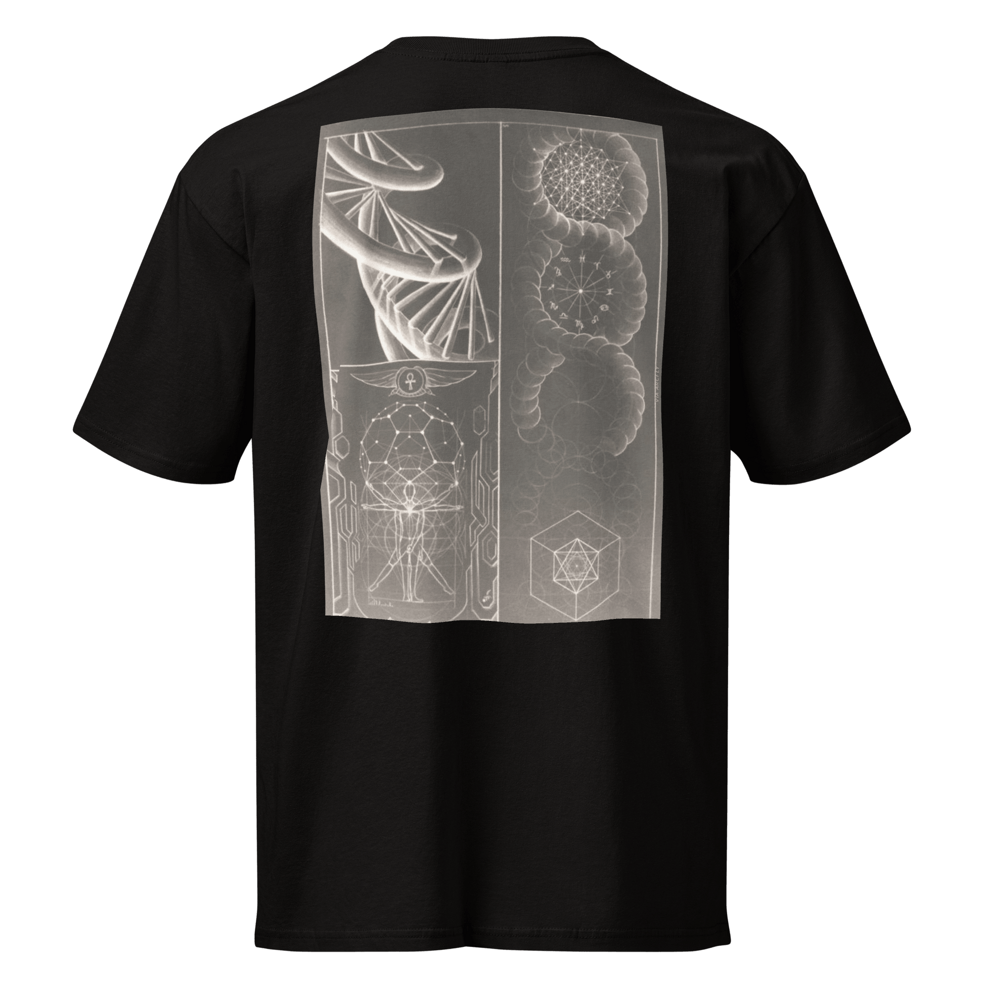 Incorporating powerful symbols such as the Ankh, known as the key of life, the shirt encapsulates ancient wisdom. This symbol harmonizes with geometric patterns inspired by Vitruvian man geometry, suggesting a timeless link between body and spirit. The overlays visually represent the alignment of humanity within the grand cosmic plan, blending into everyday esoteric occult streetwear.