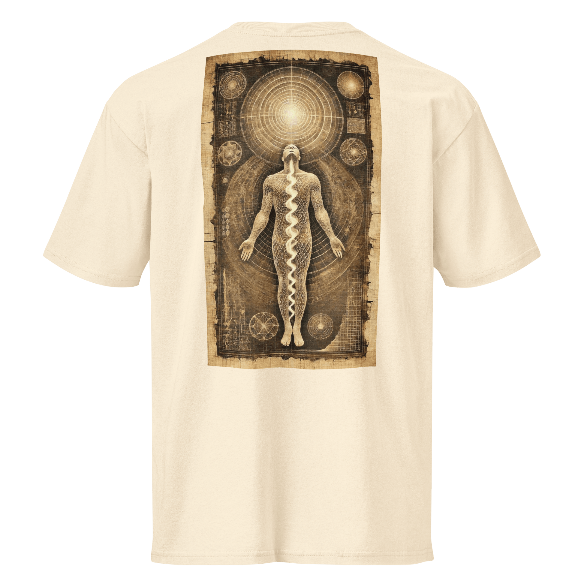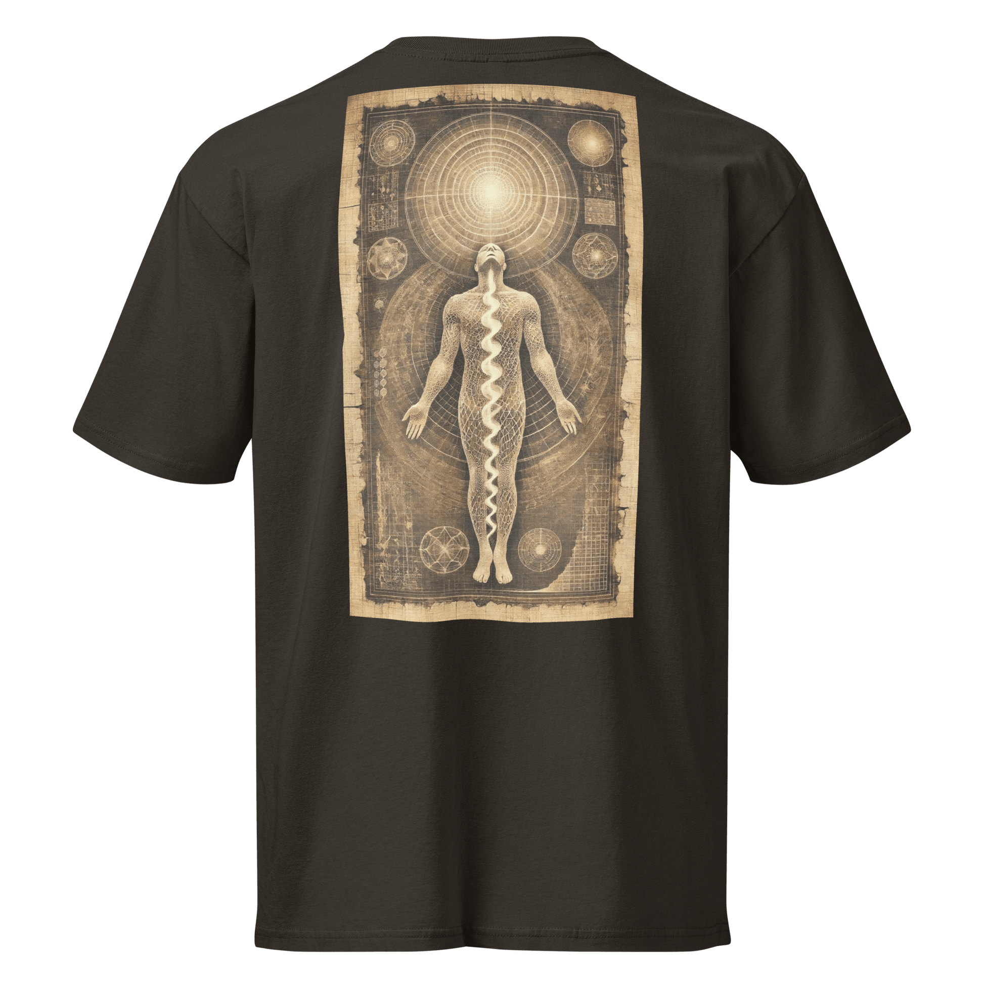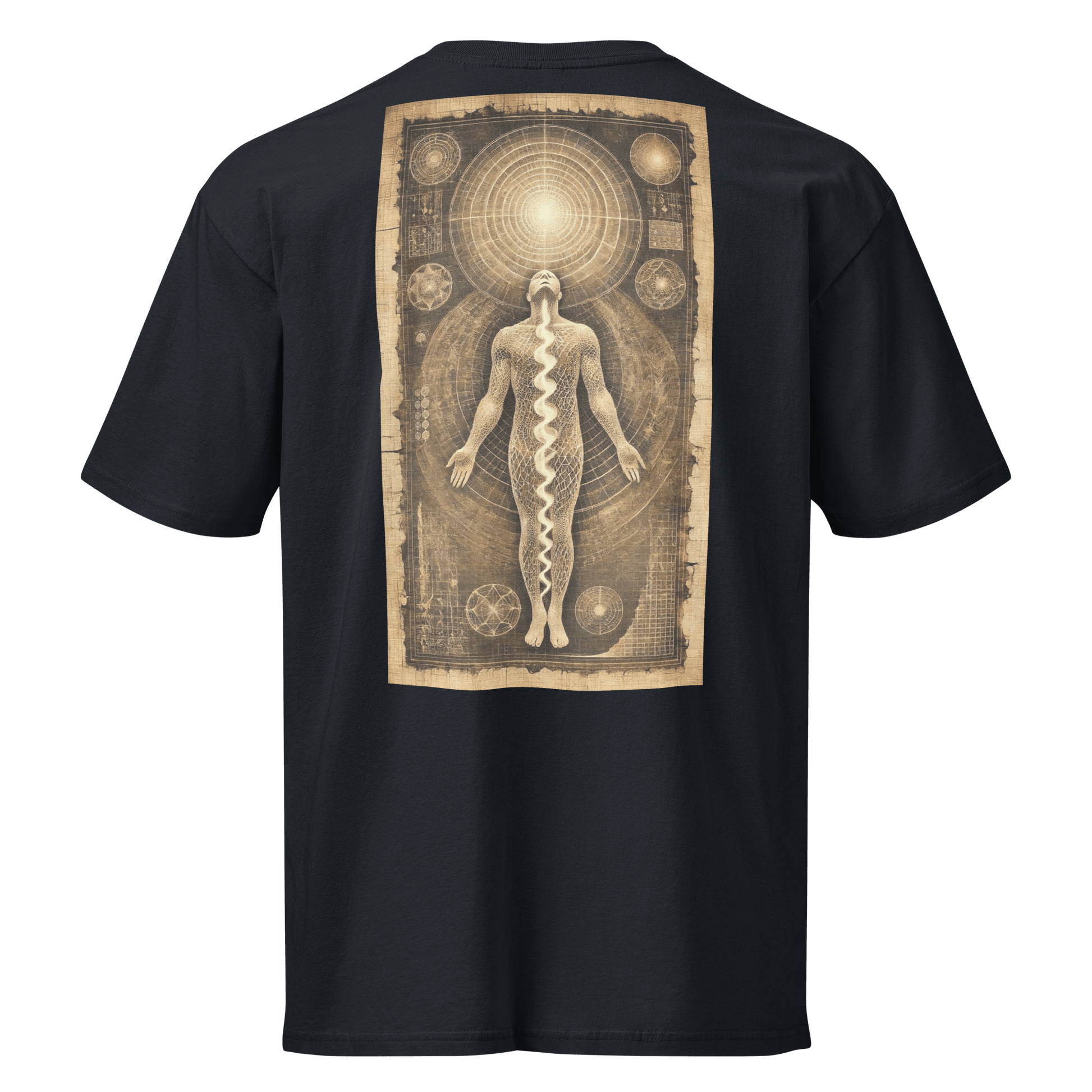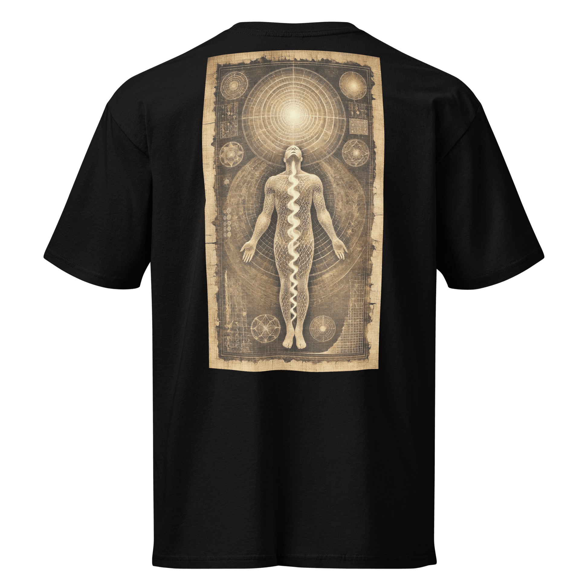 This tee is crafted for those drawn to the subtle energies of life. Depicting energy’s sacred ascent up the spine towards the crown chakra, it's adorned with sacred geometry and celestial spheres. Each element embodies mystical teachings about aligning your energy centers. It’s more than just clothing; it's an invitation to embrace personal enlightenment.